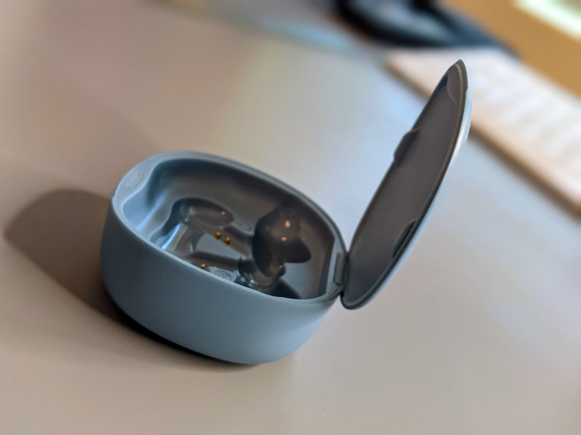 The charging case provides up to 3 additional charges and can be charged wired over USB-C or wirelessly with a Qi-compatible charger. It takes roughly 2 hours to fully charge the case.